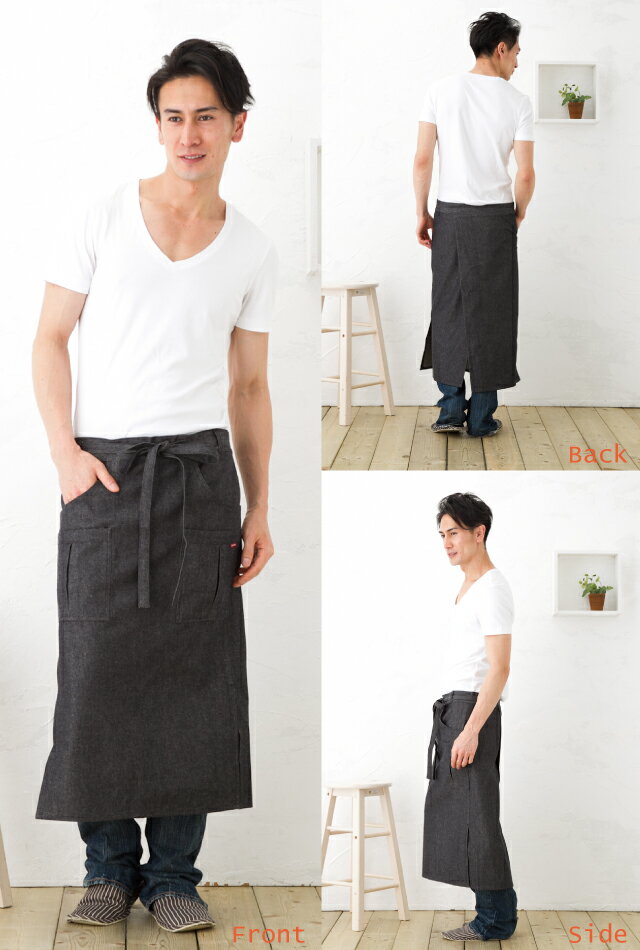 ロング丈に両サイド裾スリットで、足さばきのもたつきを軽減ジーンズ風にスクープポケットをメインにして さらにダーツ入り角ポケットを重ねづけしたポケットはとっても便利!! 品質 綿100% 素材説明 やや硬め、デニム素材 生地の厚さ 厚め カラー ブラック、インディゴ モデル 身長180cm 胸囲96cm ウエスト78cm サイズ フリー 寸法 身丈:約77cm 身幅:約108cm 製造 日本 その他 写真の関係で実際の商品と色合いが異なることがございます。